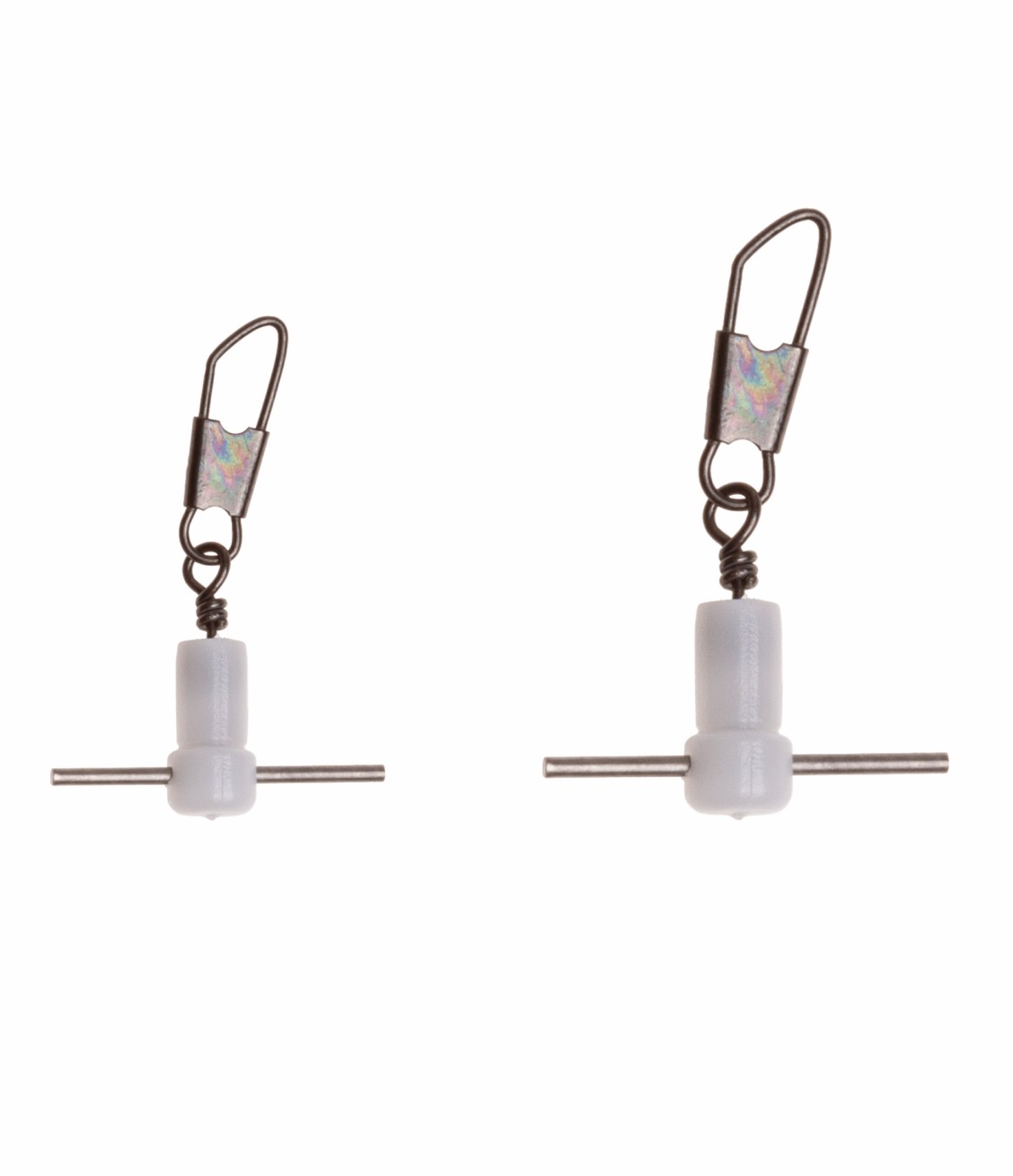 Fermagalleggianti del tipo fisso con girella e moschettone. Muniti di speciali tubetti di bloccaggio che assicurano una eccellente tenuta della posizione.