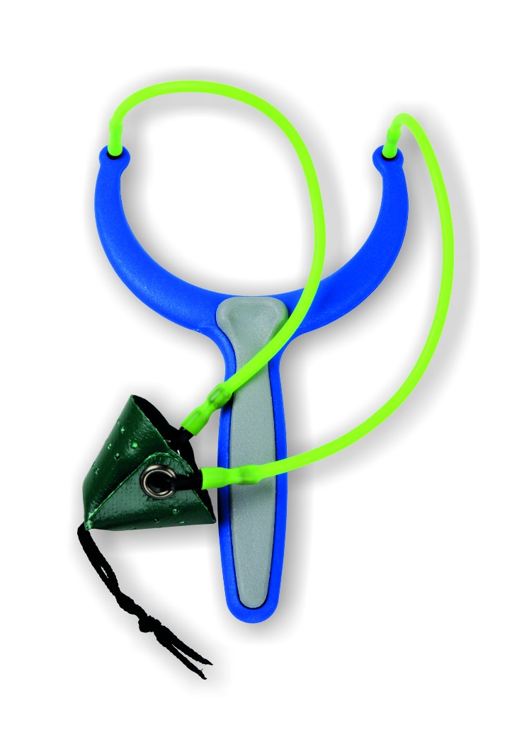 Fionda con elastici di media potenza e bicchierino piccolo con supporto plastico interno. Elastici di ricambio inclusi.