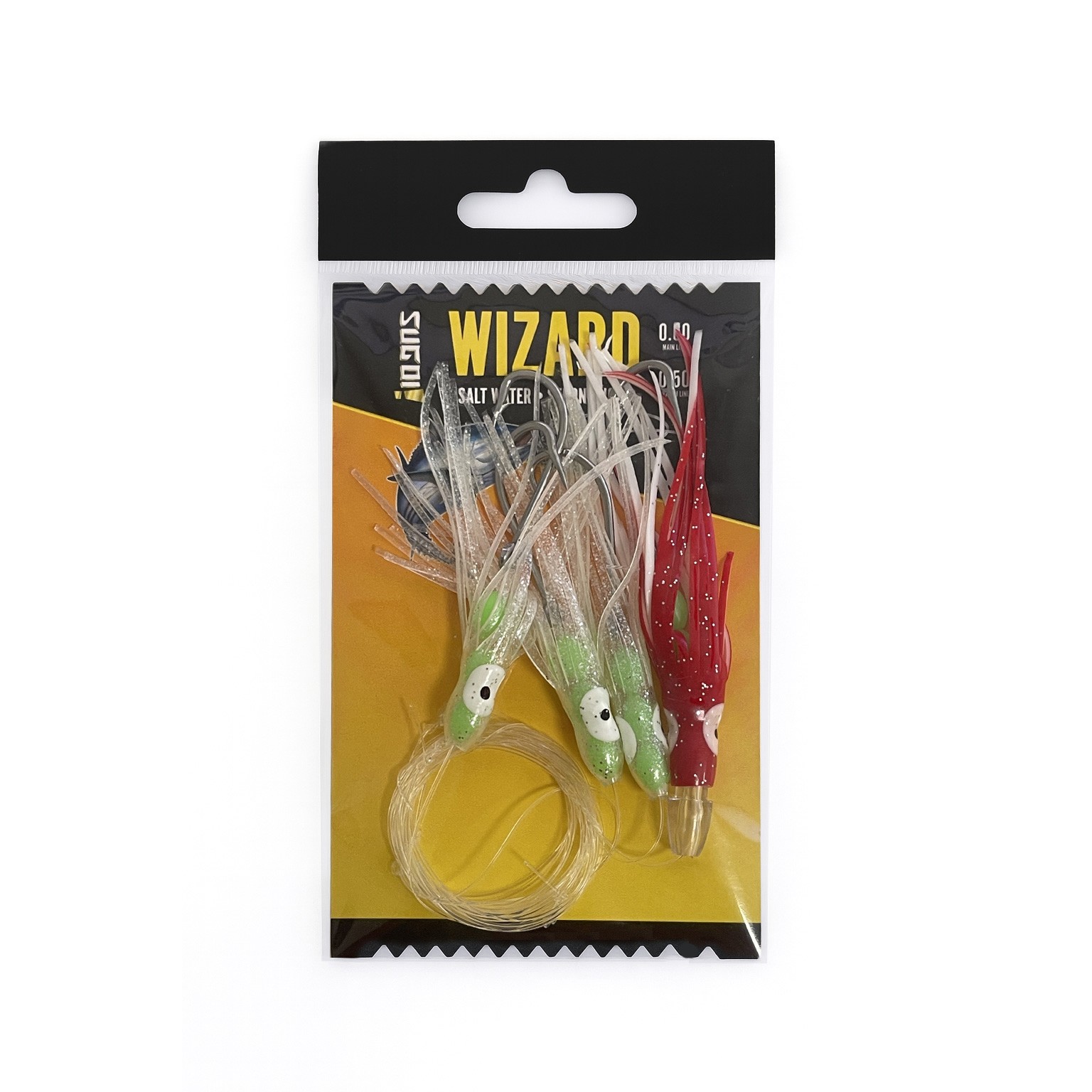 La Sugoi Wizard è una montatura da traina artigianale progettata per tonnetti, palamite, alletterati, lampughe e lecce stella. Realizzata con octopus da 9 cm e testina jet da 11 cm, è montata su ami inox gambo lungo, con madrelenza 0.60 e braccioli 0.50. Perfetta per traina di superficie a 3.5–6.5 nodi, garantisce catture continue attorno a mangianze, con efficacia testata in mare da pescatori esperti.