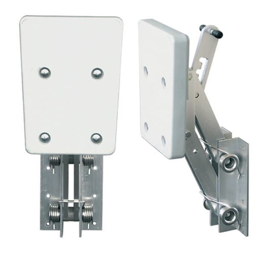 Supporto motore ausiliario a ribalta, fabbricato in lega di alluminio anodizzato e tavoletta in materiale termoplastico. Regolabile in quattro posizioni, con ritorno facilitato da robustissime molle in ACCIAIO INOX.