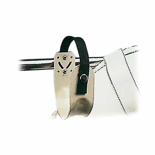 Supporto universale per salvagente realizzato in alluminio rivestito con polvere epossidica, munito di nastrino. Adatto per tubi del Ø 22/25 mm o per fissaggio a parete.