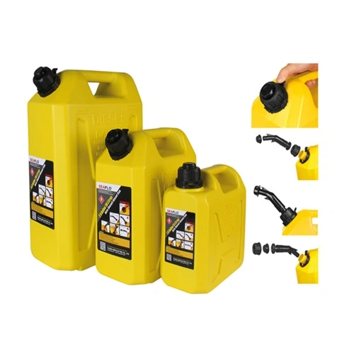 Tanica canestro di colore giallo per carburante con chiusura automatica corredato di travasatore per facilitare il travaso nel serbatoio. Progettato con una maniglia posteriore appositamente proporzionata per un versamento bilanciato e autosfiatante per un travaso più semplice e sicuro. Beccuccio di versamento a prova di fuoriuscita, resistente e ventilato. Adatta per trasporto gasolio con tappo con chiusura di sicurezza anti bambino.