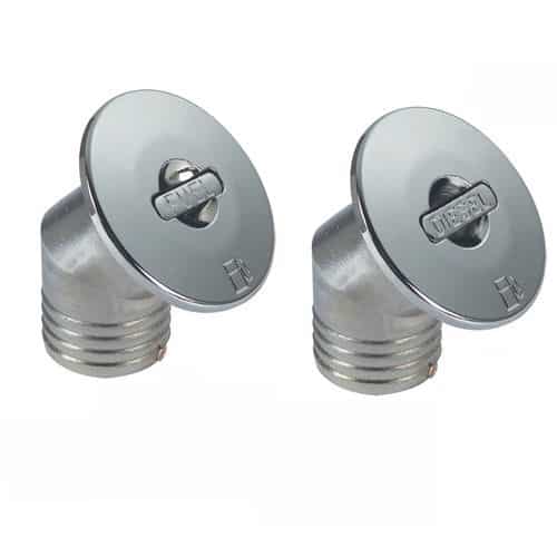 Tappo imbarco carburante inclinato a 45° in ottone cromato con levetta a scomparsa per apertura e cavetto salvatappo.
