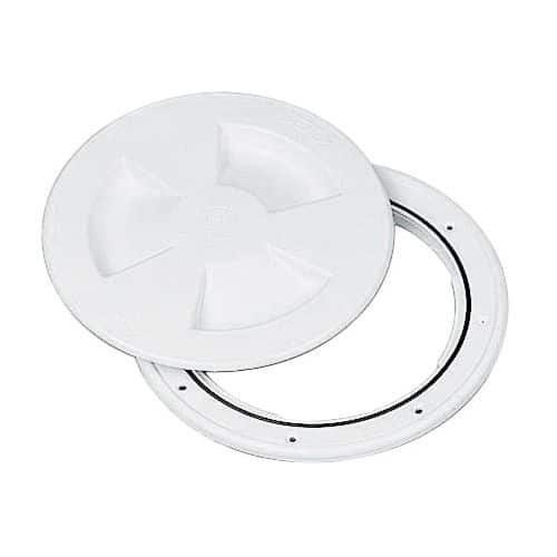 Tappo d’ispezione completo di flangia in nylon. Colore bianco.