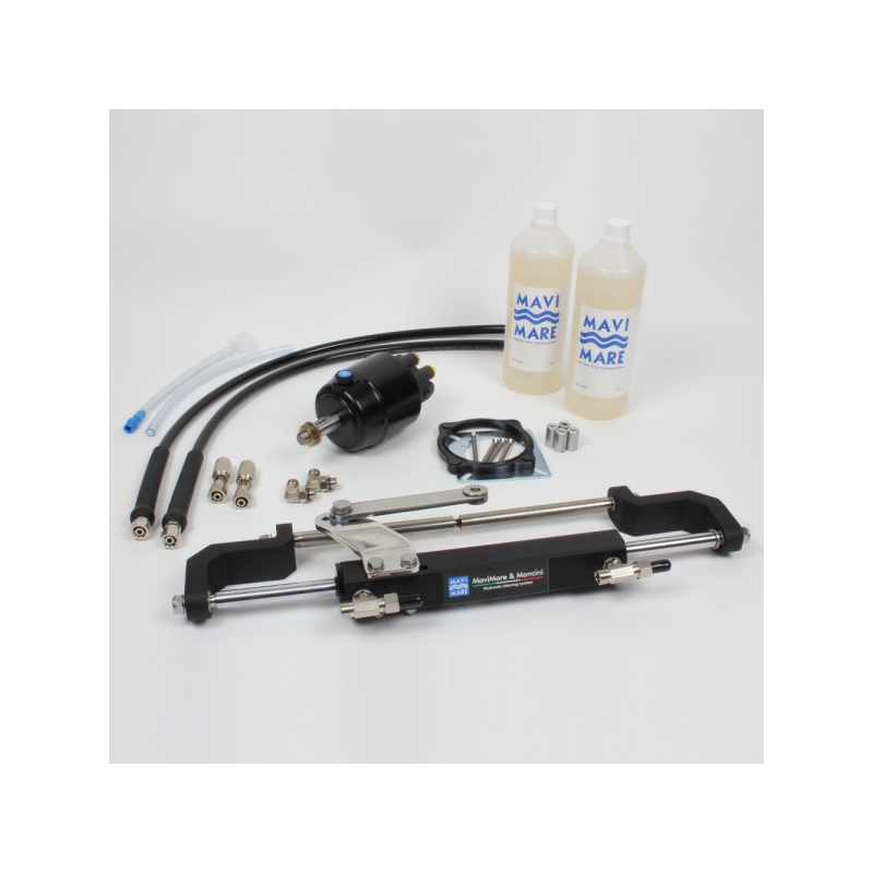 Kit GF150BRTComprende: Pompa GM0-MRA capacità 17 cc, giri da banda a banda 4,9 + cilindro MC150BR + kit raccordi + kit imbarco olio + 6×2 mt tubo SAE100R7 5/16 con raccordi pressati da un lato + 2 Lt. olio idraulico. E possibile fornire i tubi completamente raccordati fornendoci la lunghezza definitiva. Asta di collegamento al motore composta da due metà per facilitare il montaggio/smontaggio del cilindro in condizioni di poco spazio nel pozzetto. Per motori Honda 115/130 (vecchio modello fuori produzione) e Yamaha 40/50/60/70, Optimax 90 e 155 installare la leva X.342.