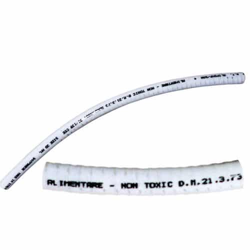 Tubo per l’aspirazione e mandata di acqua potabile in impianti idrico sanitari di imbarcazioni impiegato come flessibile di collegamento sui wc, serbatoio doccia ecc.; sottostrato e copertura lisci in PVC bianco e spirale di rinforzo in acciaio armonico. Tubo bianco con spirale per impianto acqua doccia e servizi sanitari. Tubo carico imbarco.