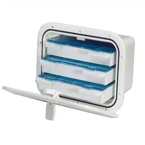 Vano contenitore con guarnizione, dotato di 3 cassetti estraibili con compartimenti interni. Ideali per il montaggio a parete su scafi Fishermann per contenere accessori da pesca, oppure come cassettiera porta ferramenta.