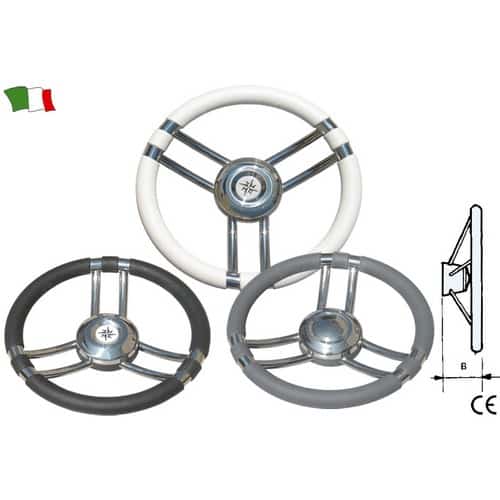 Volante a tre razze in ACCIAIO INOX e corona in poliuretano, completo di mozzo universale.