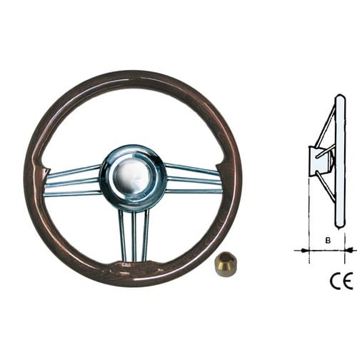 Volante a tre razze con struttura in ACCIAIO INOX lucidato a specchio e corona in mogano verniciato.Mozzo centrale con cono universale, regolabile per centrare il volante. Conforme direttive CEE.