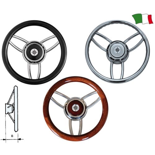 Volante a tre razze con struttura in ACCIAIO INOX ed elegante impugnatura in poliuretano. Mozzo centrale universale.