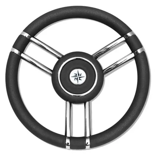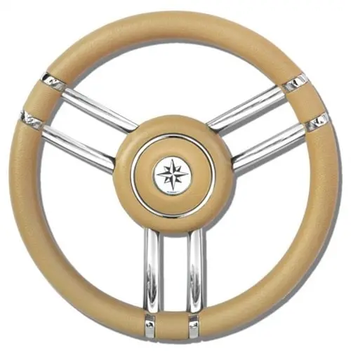 Volante Savoretti a 6 razze curve in acciaio inox lucidato a specchio con mozzo e coperchio in alluminio ricoperto di poliuretano con logo rosa dei venti al centro. Impugnatura in poliuretano morbido e inclinazione 7°.